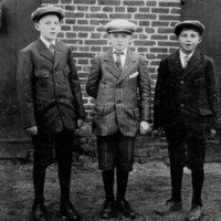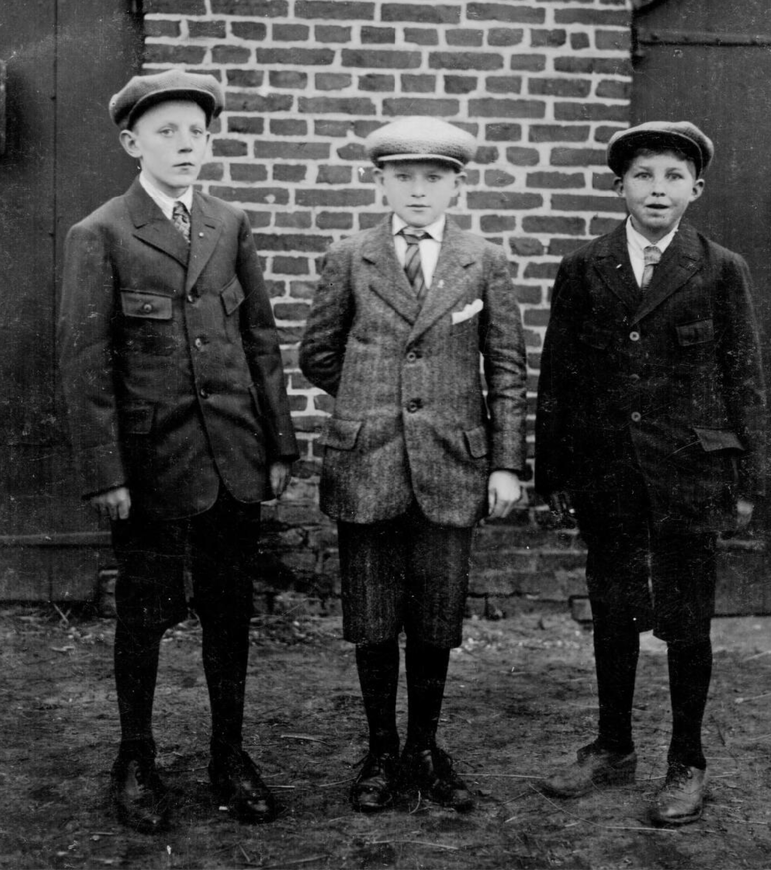 zwart-wit foto, drie jongens, jonge mannen, straatfoto, bakstenen muur, petten, korte broeken, kniekousen, schoenen, jassen, stropdassen, portret, jongensportret, oude kleding, retro stijl, jeugd, schooljongens, buitenomgeving, historische foto, oude tijd, schooluniform, jeugdportret, formele kleding, oude petten, jaren 30 kledingstijl, gezichtsuitdrukkingen, buitenlucht, plattelandsomgeving, stedelijke omgeving, strakke blik, jongensvriendschap, jongenskleding, drie personen, knielengte broek, kindermode, retro kapsels, nostalgie, bakstenen achtergrond, kraag, nette kleding, plattelandsjongens, oude fotografie, tijdsbeeld, strenge blik, klassieke kledingstijl, eenvoudige kleding, platte pet, vintage, geschiedenis, oude tijden, jeugdfoto, buitenomgeving, jongensgroep, historische kleding, zwart-wit portret, kinderschoenen, vintage mode, hoeden, formele kleding, formele pose, knopen, geklede schoenen, rechte houding, sobere kleding, jongens met pet, ouderwetse stijl, retro uitstraling, formele gezichtsuitdrukking, ouderwetse mode, broers, gezinsportret, formeel gekleed, kinderen, krantenjongens, portretfoto, historische setting, jongens in uniform, stoere jongens, oude straatkleding, familiegeschiedenis, jeugdherinneringen, jonge knapen, jeugdgroep, muur van bakstenen, jongenskledingstijl, authentiek beeld, jaren 30, jongeren, tradities, landelijke achtergrond, fotografiegeschiedenis, jeugdbeeld, schoolherinneringen, historische omgeving, foto van vroeger, tijdloze foto, nostalgisch beeld, jongensmode, retro kledingstijl, jeugdige blikken, gezichten, eenvoudige omgeving, schuchtere uitdrukkingen, jeugdige trots, nette kledingstijl, historische context, eenvoudige achtergrond, alledaagse setting, jongenspose, vastgelegd moment, ouderwetse schoenen, jonge heren, herdenkingsfoto, groep jongens, bakstenen structuur, jeugdvrienden, nette jongens, schoolportret, buitenkleding, hoedjes, klederdracht, kindertijd, formele jongens, retro omgeving, buiten op straat, nette uitstraling, jeugdige energie, ouderwetse uitstraling, puurheid, jongensgezelschap, jeugdig portret, formele presentatie, kindertijd vastgelegd, stoere blikken, oude knopen, geplooide broeken, dichte schoenen, modieuze hoeden, tijdsopname, buitenactiviteit, jongens buiten, retro sfeer, klassieke kleding, gezinsmoment, portret van drie, jongens in nette kleding, strak gekleed, tijdloze stijl, soberheid, ingetogen expressie, sobere achtergrond, simpele kleding, kindergezichtjes, stijlvolle kleding, jeugdige kledij, groepje kinderen, simpele omgeving, koude sfeer, tijdsopname van vroeger, nostalgisch moment, authentieke kleding, klassieke uitstraling, formele hoed, winterkleding, simpele omgeving, kille uitdrukkingen, tijdsdocument, gezichtsdetails, nette jongensstijl, kinderen op straat, jeugdfoto van vroeger, familie-erfgoed, jeugdige uitstraling, serieuze blikken, plattelandsjongens, gezichtsuitdrukkingen van vroeger, gestreken kleding, statige pose, klassieke portretten, tijdloos tafereel, historische kledingmode, oprechte blikken, simpele uitstraling, tijdsbeeld van kinderen, jeugd van vroeger, tijdloze jeugd, authentieke jongens, buiten staan, retro portret, klassieke fotostijl, fotografie van kinderen, strakke kindermode, portretfoto van vroeger, alledaagse kledij, jongens in pak, tijdsgetuigen, jongensleven, ingetogen kledingstijl, familieportret van vroeger, drie jonge heren, pure stijl, formele omgeving, schooljongens in uniform.
