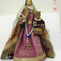 Beeldje van een madonna met kind in klederdracht met paarse mantel en kroontje. Christus met scharlaken mantel en kroontje. Glazen stolp ontbreekt.