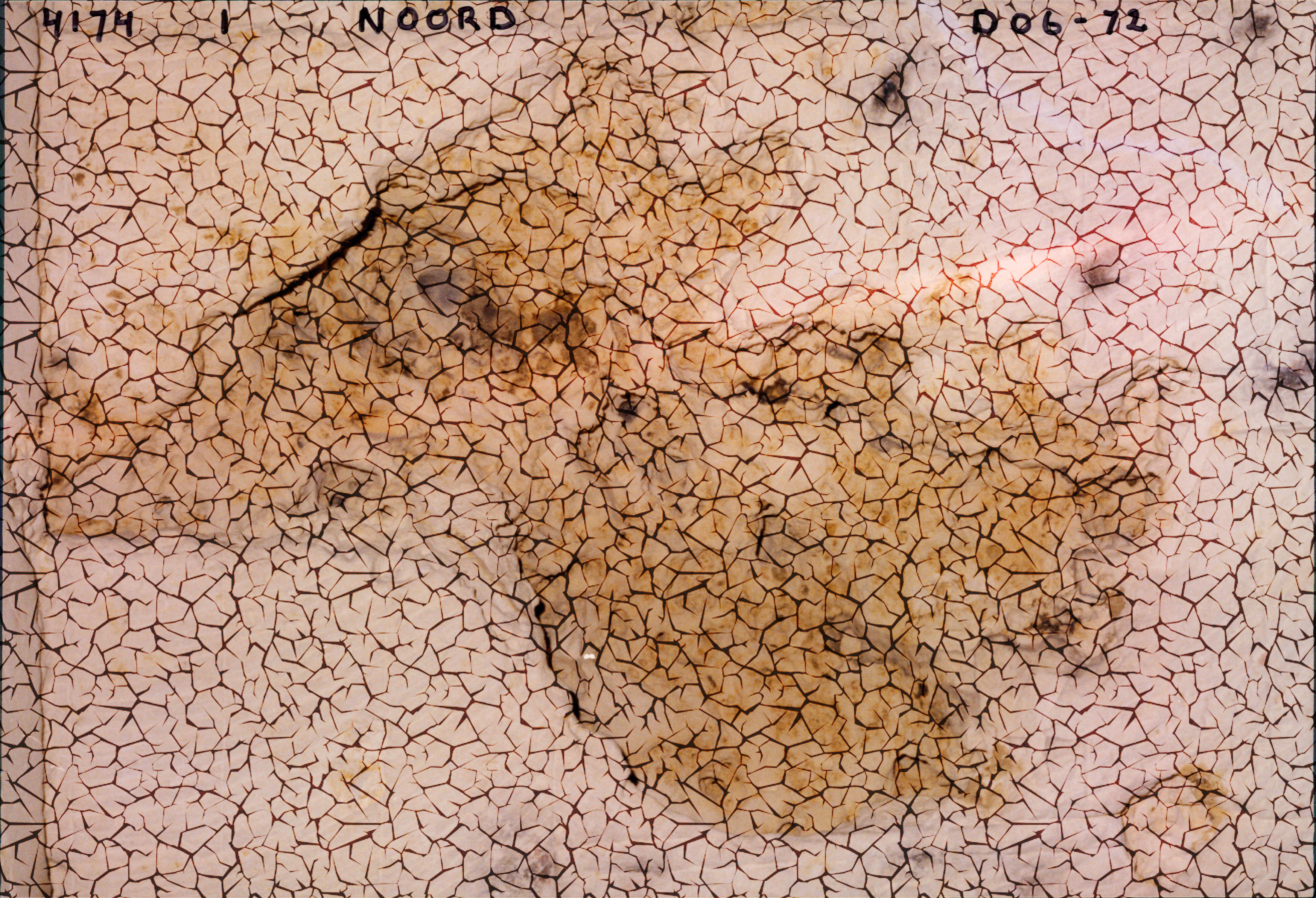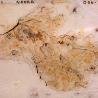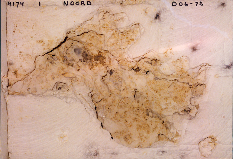 MAASTRICHT. St Pietersberg-Noord-Noord. Doorsnede van een karstholte, De bruine kleur is binnengedrongen aarde en er is ook een breuk te zien.