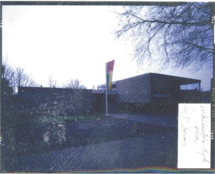 Verfindustrie Eyck, Geleen. Gelegen aan de Rijksweg Noord in Geleen. Het gebouw onderscheidt zich van de omliggende bebouwing door het sobere en consequente materiaalgebruik en de volumeopbouw. Het plan is doelmatig en eenvoudig opgebouwd. De bedrijfdgedeeltes vormen een spel van eenvoudige, kubische volumes. Het gebouw wordt in tweeën gedeeld, in een industrie/ magazijn en een verkoopadministratie. Bij een verfhandel waar de nadruk ligt op het vervaardigen en het mengen van kleuren, zou men een uitbundig kleurgebruik verwachten, maar de kleurstelling is juist sober in wit- en grijstinten. De combinatie van eenvoud, materiaalkeuze en een vindingrijke constructie resulteert in een sober, functioneel gebouw. Het geeft duidelijk uiting van de structuralistische periode bij Bisscheroux. Verfindustrie Eyck zit nog steeds gevestigd in dit pand., 1970