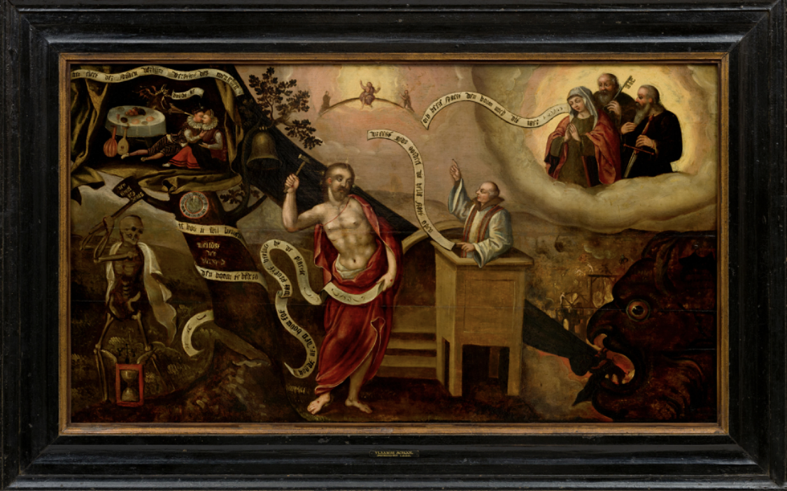 schilderij, religie, kunstwerk, Christus, dood, skeletten, bel, preekstoel, prediker, banderol, inscripties, duivel, hel, hemel, engel, wolken, gezichten, kerel, Maria, kerkelijke figuren, monniken, bijbel, rood gewaad, wit gewaad, lichtstralen, boom, blad, eten, tafereel, muzikanten, liefde, appel, uurwerk, zandloper, tijd, zonde, bekering, God, kracht, beladen boodschap, oproep, waarschuwing, moraliteit, monotoon kleurenpalet, donkere tonen, historische kunst, middeleeuwse stijl, barokke elementen, symboliek, dramatische scène, figuren, menselijk lichaam, naaktheid, lijden, spijt, berouw, angst, verdoemenis, vlammen, demonische figuur, preken, ouderling, priester, knielende man, verhoog, deugden, verzoeking, verleiding, nachtelijke sfeer, donkere omgeving, theologisch, spiritueel conflict, poort van de hel, gezichtsuitdrukkingen, schaduw, contrast, duistere symboliek, christelijk verhaal, rooms-katholiek, oordeel, verlossing, doem, retabel, altaarstuk, Bijbelse scènes, dood en leven, moralistisch tafereel, gotische invloeden, kader, massief frame, renaissance, fantasiewereld, macaber, grotesk, passie, devotie, soberheid, dramatisch lichtgebruik, schikgodin, allegorisch, historische setting, middeleeuwse kunst, kleurrijke details, gelaatstrekken, figuurlijke kunst, verbeelding, geloof, zonden, menselijke ziel, eeuwigheid, barok, vergankelijkheid, boodschap van hoop, mensheid, spiritualiteit, godsdienstige motieven, pijn en lijden, opoffering, prediking, boetedoening, tijdsbepaling, kerksymboliek, verrezen Christus, eschatologie, eeuwig leven, doodsfiguur, luidende klok, sterfelijkheid, honger, barmhartigheid, verloren zielen, rechtvaardigheid, apocalyps, visie op de dood, demonen, oordeel des Heeren, heilige Maria, angst voor de dood, smeken, audiëntie, symbool van gerechtigheid, levenden en doden, ridders, relikwieën, gezagsdragers, kerkvader, kathedraal, processie, verbeelding van het kwaad, predikanten, hellehond, schrikbeelden, tragedie, noodlot, hemelvaart, penitentie, misviering, almacht, dolende zielen, vroomheid, heiligen, hemelboog, wetenschappers, vorstelijke figuren, beproeving, bekentenis, hellepoort, eeuwig vuur, afgronden, mythologie, zielenstrijd, offergave, walgelijke demon, angstaanjagend wezen, doornenkroon, verlossingsthematiek, verhulde gezichten, afkeur, helse chaos, aankondiging, heiligdom, laatste oordeel, goddelijke genade, waarschuwingsbord, prediker aan het woord, monastiek figuur, predikstoel, misdadigheid, liefde en straf, magische symboliek, vreemdelingen, kwaad versus goed, menselijke vergankelijkheid, Bijbelse allegorieën, eenzaamheid, verdoemde zielen, zelfreflectie, symbolisch beeld, beestachtige vormen, christelijke mythologie, demonische krachten, beeldenstorm, spirituele wereld, dialoog tussen mens en God, oude geschriften, klokken, goddelijk koninkrijk, spiritueel erfgoed, bijbelse tijdlijn, lam Gods, verloren paradijs, tragische figuur, heldere kleuren, sacramenten, kerkelijke ceremonie, liturgische elementen, kerkrituelen, kerkelijke hiërarchie, strijd tegen de dood, kunsthistorische waarde, verloren deugden, stervende ziel, theologische reflectie.