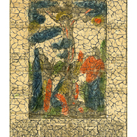 Christus aan het kruis met aan zijn rechter zijde Maria en aan zijn linker zijde Johannes de Doper. Aan zijn voeten huilt Maria Magdalena. Op de achtergrond de stad Jeruzalem. In de lucht pakken zich donkere wolken samen. Om de voorstelling aan alle zijden stichtelijke teksten.
