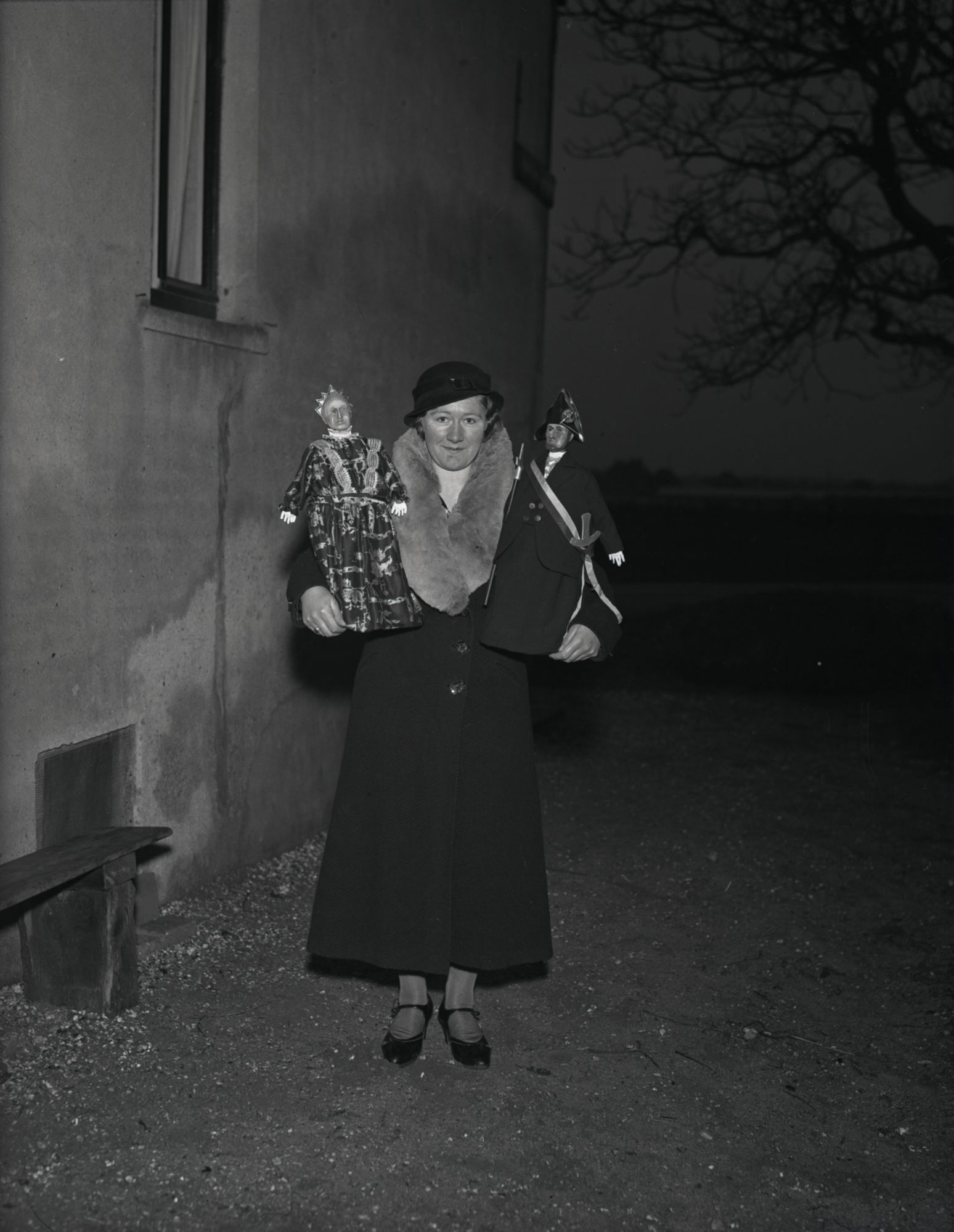 vrouw, poppen, zwart-wit, oude foto, buiten, nacht, donkere lucht, schaduw, muur, stenen vloer, hoed, bontjas, lange jas, handschoenen, glimlach, schoenen, schoenen met bandjes, pop, kledingpop, soldatenpop, uniform, traditionele kleding, details, gezichtsuitdrukking, decoratief, sierlijk, houten bank, historisch, oude tijd, traditie, vooroorlogs, Europees, cultureel, erfgoed, volkskunst, huis, gebouw, familie, herinneringen, nostalgie, poppenspeler, volksvermaak, schaduwen, lamplicht, dramatisch licht, winterkleding, laarzen, zolen, vrouw met pop, sierlijke pop, pop met kroon, handgemaakt, ambacht, speelgoed, historische kleding, soldatenmuts, klederdracht, creativiteit, handwerk, tradities, folklore, veld, winteravond, silhouet van boom, herfst, koud, knus, middeleeuws, modern, 20e eeuw, vroege fotografie, dramatische scène, sociaal leven, vrouwelijk, kunst en cultuur, dorp, dorpsleven, rustiek, plattelandsleven, tijdsbeeld, schemer, familieleven, volkskunstenares, figuren, handpoppen, gezelschap, vermaak, menselijke activiteit, speelpop, ambachtsvrouw, zelfgemaakt speelgoed, sieraden, medaillon, vrouw in de nacht, accessoires, koninklijke figuur, soldaat, sierlijk, vrouwelijkheid, traditie en cultuur, poppentheater, bezigheden, vereeuwigd moment, handgemaakte kleding, historische gebeurtenis, uitrusting, dagelijkse bezigheden, formele kleding, sieraden, traditiegetrouwe kleding, doorleefd gezicht, volksfiguren, persoonlijke uitdrukking, theater, tijdloze foto, stilstaand beeld, bewegingloze actie, donker decor, verlichting, kijkend naar camera, observeren, traditionele rol, pop en poppenspel, avondscène, oud en nieuw, cultureel erfgoed, vermakelijk, gezelschap, mens en pop, stilleven, gezichtsschema, tijdloze sfeer, melancholiek, eeuwenoude traditie, nostalgisch moment, volkskunstpoppen, oude vrouw, gezichtsuitdrukking, persoonlijkheid, aardse kleuren, donkere tonen, scherpe contrasten, verhalend beeld, verhaal in beeld, stille straat, afgelegen, documentatie, leven in beeld, puur, vrouw met trots, zelfbewust, pop als symbool, symboliek, maatschappij, Europese cultuur, zelfgemaakt, betekenisvol, artistiek.