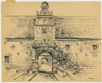Poort van het kasteel Mheer. Poort van het kasteel. 'Ik was nieuwsgierig en wou graag op de binnenplaats achter die poort kijken. Plotseling zag ik dat er Duitsers in het kasteel zaten en heb ik op veilige afstand deze tekening gemaakt.' uit: Tekeningen van Sjuwke Kunst, Limburg, 1942-1943, p. 50.