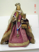 heiligenbeeld Beeldje van een madonna met kind in klederdracht met paarse mantel en kroontje. Christus met scharlaken mantel en kroontje. Glazen stolp ontbreekt.