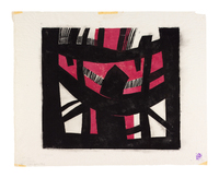 Compositie van abstracte vormen Gesigneerde zwart-wit afdruk van een houtsnede in passe-partout van een abstracte compositie in zwart, rood en wit. Een breed, zwart, u-vormig kader omgeeft de voorstelling. Hier tussen lopen van links naar rechts twee brede, zwarte banden. Vanuit onder in het centrum loopt tot halverwege een brede zwarte band omhoog. Enkele smallere zwarte verticale en diagonale lijnen verbinden het kader en de banden. Achter de zwarte banden is een rode vorm zichtbaar, in de vorm van een kruis. Centraal door deze rode vorm loopt horizontaal een band met zwart-witte verticale streepjes. Ook bovenin de voorstelling zijn twee zones van dunne, korte en langere, verticale strepen zichtbaar.