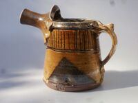 Scènes familliers "Humor/spot. Lithografie, gekleurd en gedeeltelijk afgedekt met eiwit om meer diepte te verkrijgen. Dikkere militair op de voorgrond. Achter zijn rug lachen de bezoekers van de markt hem uit.Titel en tekst boven en onder de lithografie: Scènes familliers. / Fait y son fendant à c't'heure! Cijfer boven rechterbovenhoek: No. 19.