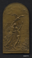 Penning Penning. Voorz.: alleg. voorstelling: vrouw en naakte jongeman in landschap; vrouw draagt vogel op haar hand; de jongeman strekt beide armen uit naar een vliegtuigje in de lucht