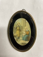 Prent Heilige Familie Ovaal gekleurd prentje Heilige Familie. Rechts: Jozef in timmermanskledij bij werkbank, krijgt lelie van Jezus die op schoot van Maria zit (links). Op voorgrond timmermanskist. Tafereel speelt zich buitenshuis af: huisdeur tussen Jozef en Jezus in. Prent op zwart fluweel in ovale messing lijst achter glas.